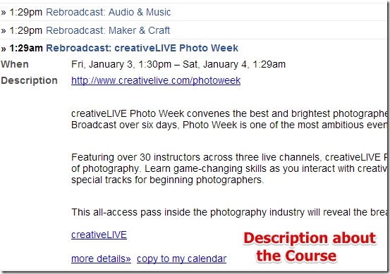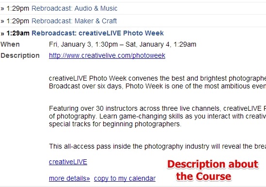 To keep track of the free online courses, creativeLIVE provides the calendar in which you can view the time table of the live courses that are planned for the month. Note that, the courses are broadcasted live and can not be viewed later for free. You have to buy the courses if you want to view them later.