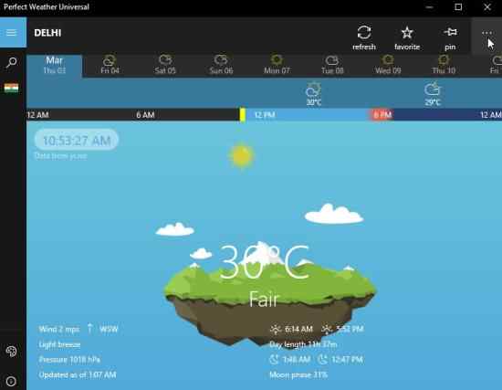 Perfect Weather Universal is a free Windows 10 weather app which shows weather forecast for the current day as well as 9 days ahead. The weather forecast is shown in beautiful templates that are offered by the app. Apart from that you will get details about wind, pressure, day length, moon phase, sunrise time, sunset time, moonrise time, and moonset time.