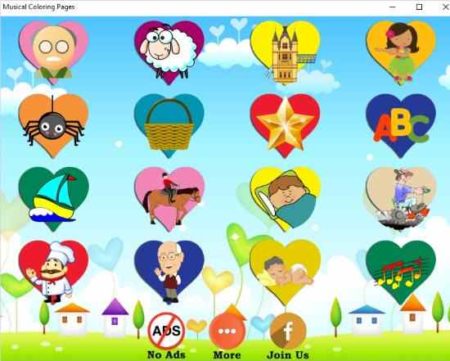 Windows 10 musical coloring pages app for kids can be downloaded from the Windows 10 store or from the link given at the end of this article. When you start the app you will see an interface like the one shown in the screenshot below.