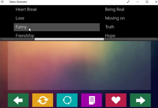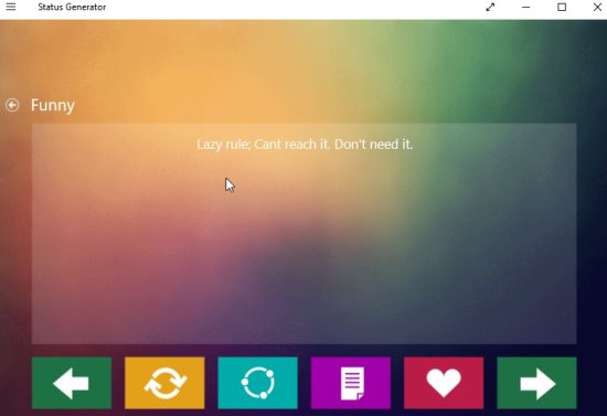 The above screenshot shows how the random status update messages will show up. The forward and back arrow button are for going to the next or previous status message. The heart button is for adding a message to your favorites list. The page button is copying a status update message to your clipboard and from there it can be pasted anywhere. The circle button with three dots is for sharing the status message. While the circle button with two arrows is for generating a random status update message.