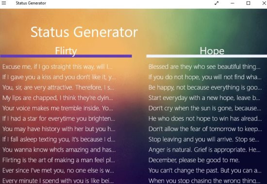 Status Generator is a free Windows 10 app to generate random status messages for you which you can use to update your social network accounts. This Windows 10 status generator app lets you select a new update everyday out of its collection of 2000 plus updates. You do not need to go search for cool status updates on the internet. Simply use this app.