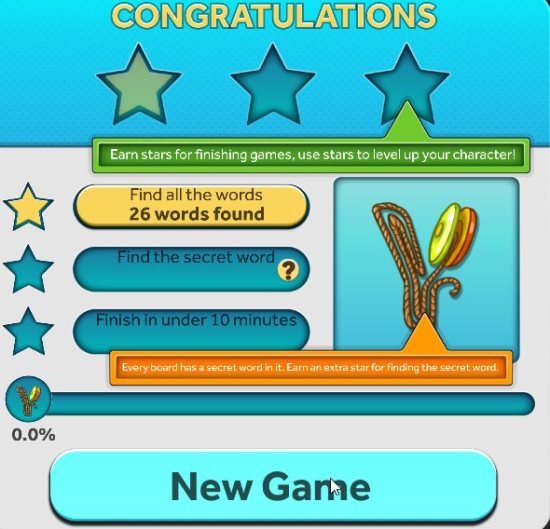 At the end of the puzzle when you have found all the words a pop up window like the one shown in the screenshot below will come up.