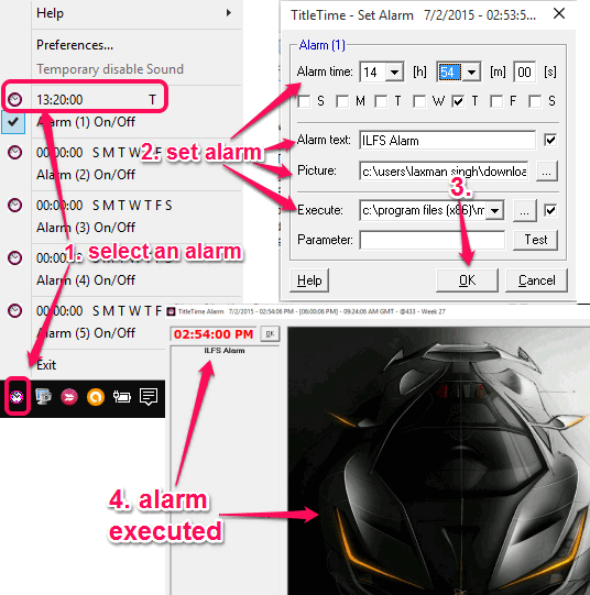 - You can set up to 5 different alarms. Alarms can also be configured to automatically show an image, user-defined text, and execute an application (*.bat, *.com, or *.exe) on exact time and date. You need to right-click on the system tray of this application to use an alarm and configure it. See the screenshot visible below: