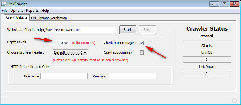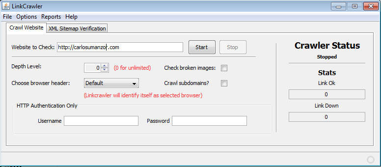First thing that you need to do we’ve already mentioned, enter the URL of the web page that you’re interested in checking. After that, you should go over all the different options that Link Crawler has: