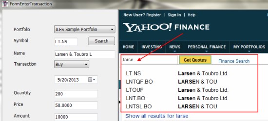 The process begins by entering a stock or share ticker “Symbol” in Yahoo format (Symbol followed by a dot followed by the Exchange code) and searching for the corresponding Stock Exchange name. Zoom Portfolio Manager offers a search facility if you don’t know the exact Symbol and fetches the Stock Name matching to the specified symbol.