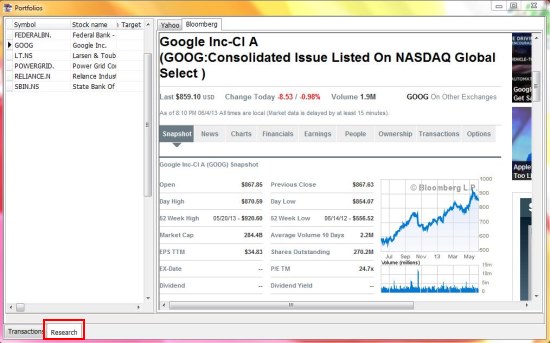 The “Summary” tab at bottom represents the summary of selected transaction in form of chart (if available). And the “Research” tab lets you view more information about the stock exchanges, live from Bloomberg and Yahoo Services.