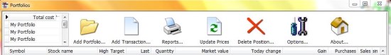 This will take you back to the main window of the program, where you will get a new transaction record added to your portfolio. Now you just need to press the “Update Prices” button to get your portfolio valuation done. Zoom Portfolio Manager will automatically fetch data (including current price, market value, etc. ) from Yahoo Finance and calculate values for capital gain, price-earning ratio, dividend yield, etc.