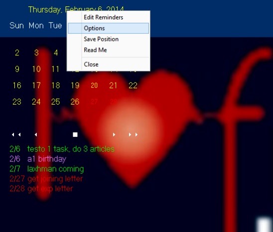 I liked that the freeware is pretty much customizable. There’s a help file named “readme.txt” for customizing and adding reminders, in the downloaded zip file. Still, the freeware is well made and you won’t need any help for customizing the calendar attributes and adding reminders. Simply right-click on the calendar, and click on Options button. This opens an easy to use window for setting calendar’s attributes. There are 5 tabs, consisting of: Options, Highlight, Tooltips, Reminder Types, and Other.