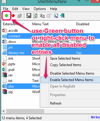 Step 3: To enable all the disabled entries, just select all disabled entries on its interface, and tap on Green button. Moreover, you can also right-click on disable items to access Enable Selected Menu Items option.