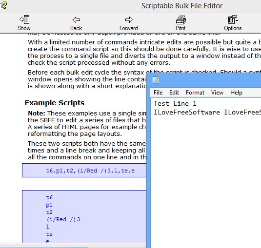 Example code above removes all the lines from a text document except the first one, and then adds a new line where it writes ILoveFreeSoftware three times. This is just an example, there’s dozens more commands that you can use to edit text documents. Key features of Scriptable Bulk File Editor are:
