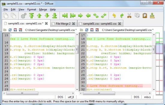 Diffuse is a free file comparison software that lets you compare and merge text files on your system. With this tool, you can compare any number of files at one point of time and find the differences between them. It highlights the differences so that you can visually compare files, and also allows you to manually edit the lines. Diffuse supports a lot of popular programming languages, including C#, C++, CSS, Fortran, HTML, Java, JavaScript, JSON, JSP, Pascal, Perl, PHP, Python, SQL, VB.Net, XML, and more.
