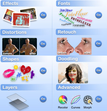 FotoFlexer even lets you edit the photos from popular sites such as Photobucket, Facebook, Myspace, Picasa, Flickr, Phanpfare, Smugmug, Yahoo Search.