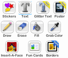 - Decorate: Includes Stickers, Glitter Text, Draw, Erase, Borders, Posters etc.