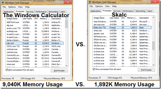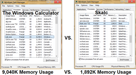 - Skalc is very processor friendly as it uses a substantially less amount of memory compared to the windows calculator. The screenshot below validates this fact as you can clearly see Skalc using only 1,892 K Memory vs Windows default calculator using 9,040K of Memory. Hence, it goes easy on your system, without compromising on features.