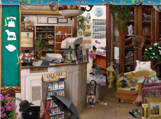 There are certain number of items to be discovered from the crime scene within a time limit. The items are listed in the left column as three in a series; you will have to find one of those three items that is hidden somewhere in the crime scene. Once you explore one those three items listed, the next undiscovered item is added to the list. The game also has a “Tip” bar for you. A click on that will give you an idea about where that topmost item on the list is hidden in the crime scene.