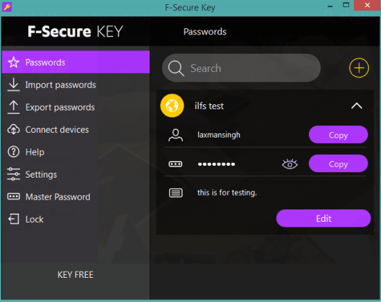 F-Secure KEY is a fantastic password manager and a good alternative to LastPass. You can add login details for multiple online services or bank accounts, edit details, and search for a particular item from the bunch of stored credentials anytime. Instead of showing the original password for an account on its interface, you can also generate a strong password using special characters, upper & lower case letters, and numbers.