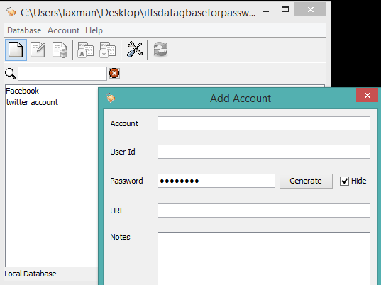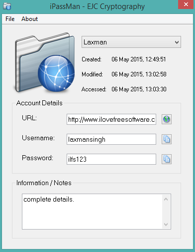 iPassMan is also a good software to store login credentials of different accounts and protect them with a master password. You will be able to add a URL, password and username, and notes/information with every single account. Option to copy and paste username and password is also available. However, you must be careful while saving your password as it doesn’t hide password neither it lets you generate strong password to cover your actual password. It is not a strong alternative to LastPass, but a simple solution to manage passwords from desktop.