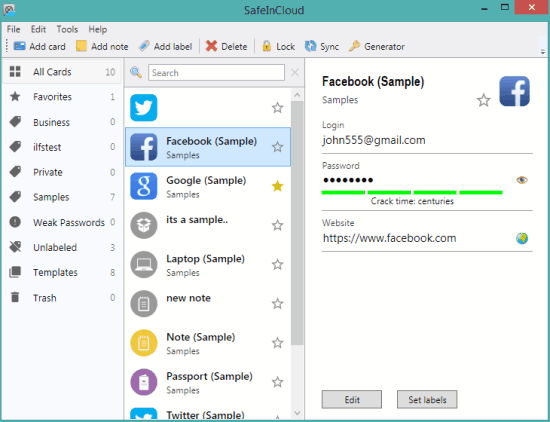 Safe In Cloud is a strong LastPass alternative software in this list. It is available in portable and installer version. You can create multiple labels and can insert different cards with login credentials to those labels. Option to add notes and generate strong passwords are also available. You can also install its extension(s) for different browsers to automatically fill username and password for saved websites. Although its Android and iPhone apps are also available, but those are not available for free.