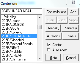 The Search option provides you with options which help you in locating and focusing on any particular celestial body. You can either choose to enter the name or simply click on the corresponding button (Constellation, Comets, Asteroids, etc..) to get the list of all bodies related to it.