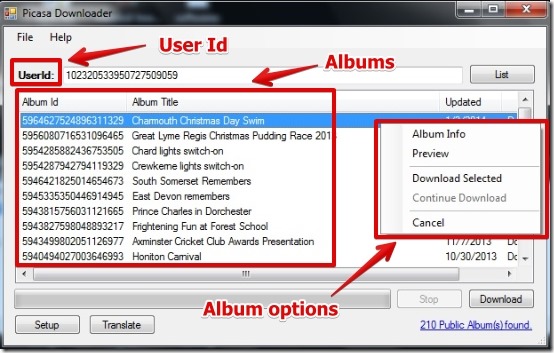 In order to download the photo albums you can write in the user id and then click on List. You will have all the albums (of that particular user id) listed in a neat way along with the album title, date updated, number of photos.
