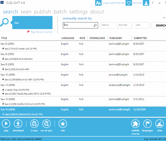 Sublight is also a great subtitle downloader software that lets you batch download subtitles for multiple movies or TV shows. You can either drag n drop a single movie or a whole folder to fetch subtitles from up to 10 different resources. Apart from this, it lets you play downloaded subtitles with your preferred media player. So you will be able to check if sync of subtitles is proper or you need to find more subtitles.