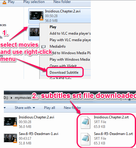 SubSeek (beta) is the easiest software in this list. It lets you download subtitles for multiple TV serials or movies in just two clicks. After installation, it will integrate with Windows Explorer context menu. After this, you can select desired movies and use Download Subtitle option available in the context menu. Within a few seconds, it will download subtitles for you.