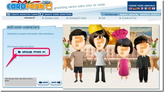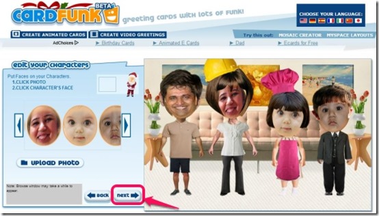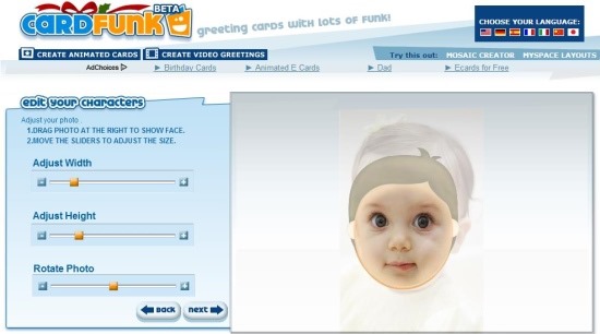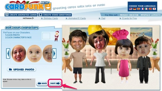 Cardfunk lets you create animated greeting cards and video greeting for various occasions like Valentine Day, Christmas, Birthday, Fathers Day, Mothers Day, and much more. It offers you 13 funky templates to create animated greeting cards and 7 templates to create crazy video greetings. Choose the photo from your PC whose size should not exceed 2 MB, then upload and resize it to fit into the face frame and you are done. It takes a few minutes to create crazy funky animated greeting cards. You can share via email and copy paste the embed code on social networking sites, blogs, or websites. Come lets create one below.