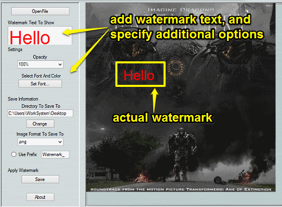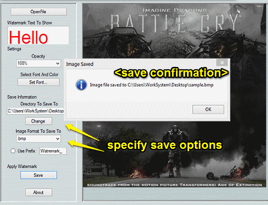 Step 2: Once you’ve added the textual watermark, you need to specify the save information. As mentioned in the article before, you can change the save location, as well as the format in which you want to save the watermarked image in, using the corresponding options. You can also optionally add a prefix text to the watermarked text. Once done simply hit the Save button.