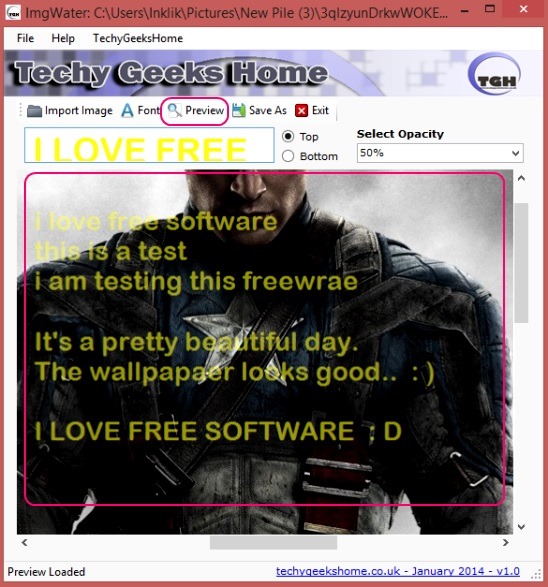 The software is too easy to work. All that is required from your end is, import the image, add watermarking text, view the preview, and save the watermarked photo. That’s pretty much it. There are buttons for all these operations at the tool bar. These consists of: Import Image, Font, Preview, Save As, and Exit. Below these, there’s a text field where you can enter watermark text, an opacity drop down list, and two options to decide for placing watermark text position.