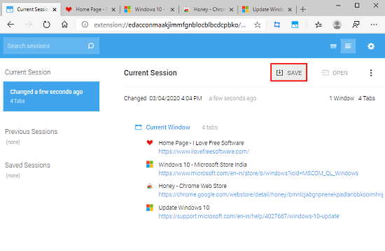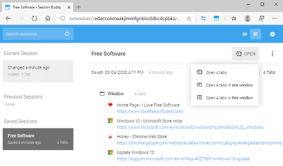 Session Buddy is a great extension tool to restore a previous session in Microsoft Edge Chromium. Using this tool, you can easily free up unnecessary stuff in the hard disk and to avoid clutter. The latest version of the application is 3.6.3 and it stores only 875 kB of your computer memory. After the proper installation of this tool, you can manage open windows and tabs in one place.