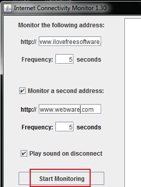 Interface of this software is quite simple. You simply need to enter website address along with the desired monitoring frequency. After this, hit the ‘Start Monitoring tab’ and it will check the connections to those websites. You can also enable the Play sound on disconnect option that will help you to notify that connection is down. All the monitoring activity can be seen at the right side on its interface.