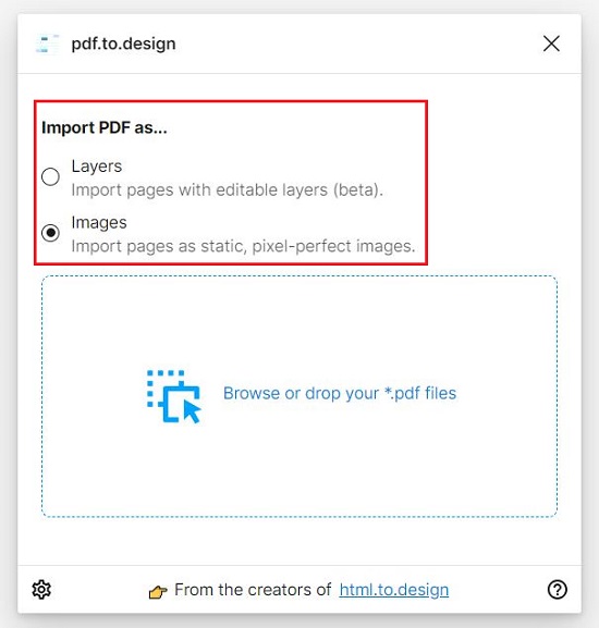 3. Choose how you would like to import the PDF by clicking on any one of the two options such as ‘Import pages as editable layers’ or ‘Import pages as static images’ and then drag and drop your PDF files on to the plugin window.