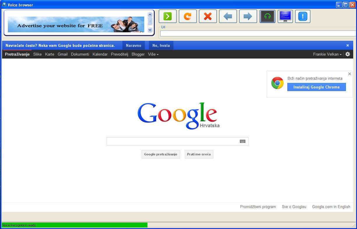 This is the default window that waits for you after launching Voice Browser. Notice that this application is ad supported, ads are present in the top left corner, but they are not very invasive and your browsing experience shouldn’t suffer because of it. Browser isn’t rich with features, as you can see it’s pretty basic, but great thing about it would be the fact that each one of the options that you see above can be voice activated and used.