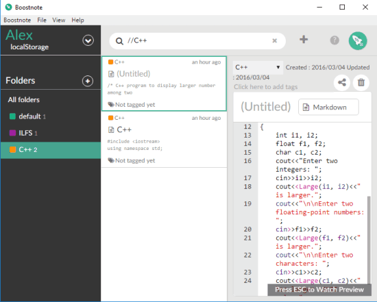 Here is a free note taking software, called Boostnote, that comes with Markdown support and code syntax highlighting. Despite the fact that it’s a simple note taking software, it has included some very good features. You can write in Markdown language and the output can be previewed by right-clicking on the editor area. Also, you can use it to write programs for C, HTML, Java, C++, and other programming languages. It can recognize over 100 languages and highlight syntax.