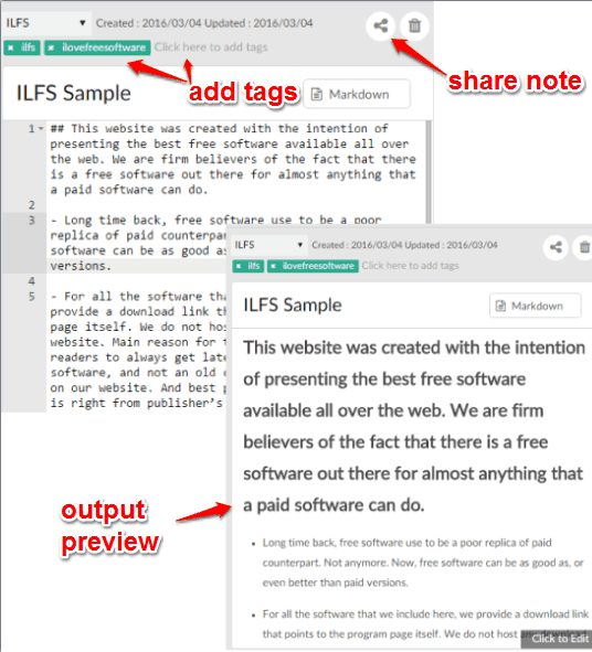 Click on a file and its content will visible in the right section. This is the most important section where you can edit your article/note or create a new note. You can also use Markdown while editing a note and preview output quickly by right-clicking on the editor or clicking Markdown button. A share icon available above the Markdown button will help you generate the public link of your note and share with anyone you want.