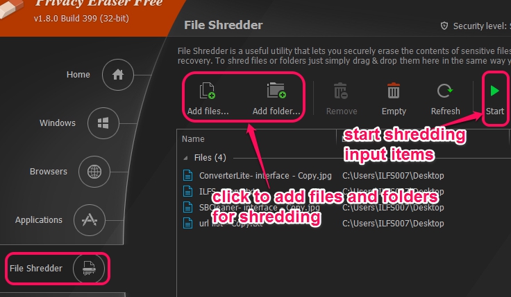This section helps to add and remove those files and folders, which you want to remove securely. It will erase contents of added files securely, but only Simple zero-fill (1 Pass) deletion method is supported with free edition. If you need to use more secure deletion methods, then you can try Catalano Secure Delete, Soft4Boost Secure Eraser, and Moo0 File Shredder.