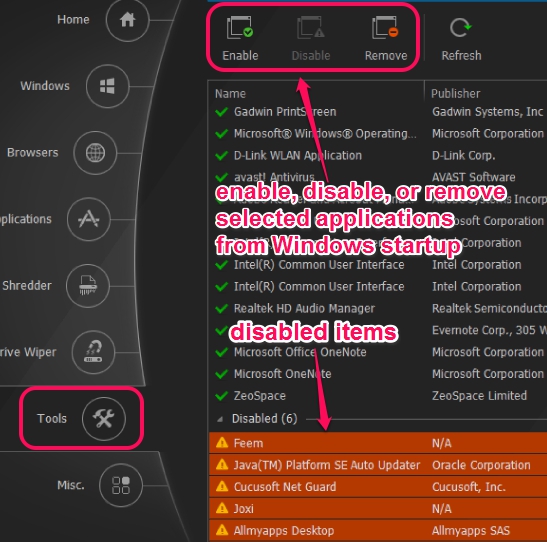 This is one of the important section of this free PC cleaner that helps to manage startup entries. In this section, list of all applications will be visible to you, that starts when Windows starts. From that list, you can select multiple items to disable them or to remove them from startup list. By disabling unwanted items, boot time of Windows will improve a bit.