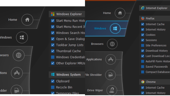 These are two different sections using which more entries for scanning and cleaning can be added. Such as: Windows DNS cache, font cache, invalid start menu shortcuts/desktop shortcuts, Windows event logs, tray notifications cache, Windows credentials, browsers auto fill form history, saved passwords, site preferences (helps to set ‘allow pop up’ preferences, permissions etc.), etc. You simply need to select entries and then you can perform scanning that will include added entries as well.