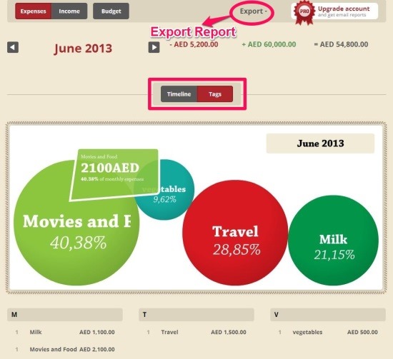Toshl Finance tries to be a fun app. It automatically calculates your incomes and expenses and displays it in the form of a Timeline. The app also facilitates you with nice animated graphs that can be viewed by clicking on Tags View. It gives you a beautiful view of the animated giant balloons and organizes your expenses accordingly. As you hover your mouse on these balloons, they will let you know the percentage of that particular expense with more details. The Export button located at the top allows you to export the income/ expense report to CSV, Excel, PDF, Google Docs and Evernote.