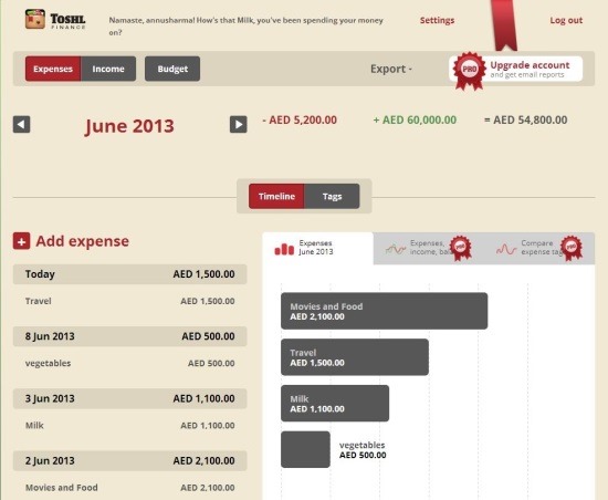 Toshl Finance is a personal finance management cool tool that can be used to track your expenses. To use this app, you need to click on “Add to Chrome” and launch the app. Before you begin to track your money, you need to sign up with your account. As soon as you sign up it asks you for confirmation and lets you enter the currency which you use often. Once you are done with this, it automatically redirects you to the main page where you can enter the incomes, expenses and make your budget.