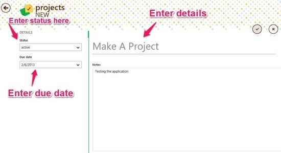 To add a project in Task by Telerik, just click on the plus button just besides project label. This will bring up the window as shown in the screenshot below. Now just enter the details, status, and due date to create a project in Task by Telerik. After you have added the projects you can assign tasks to the these projects and manage your projects with ease. In this manner this task manger for Windows 8 allows you to manage projects with complete ease.![]()