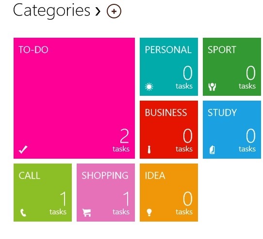 The app has a simple interface and you can add tasks, create projects, and add tasks by categories. I just love the categories aspect of this task manager for Windows 8. These categories are color coded and have tags; this makes it extremely simple to know what you have to do with just a single glance of the main interface of the his app as shown in the screenshot below. This task manger app for Windows 8 allows you to create custom tasks as well. This can be done by clicking on the plus button which is located besides the categories label as shown below.![]()