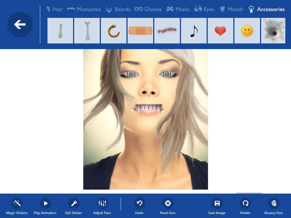 On the bottom of the screen you will find options for adding effects like: Magic stickers, Play animation, Edit sticker, Adjust face, Rotate, Bouncy Goo and few other options as well.