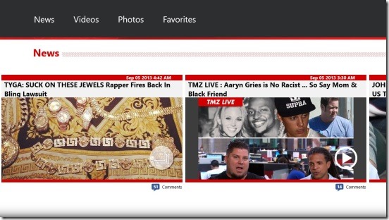 TMZ app is a free Windows 8 celebrity news app. It is the official client app of TMZ which is basically a celebrity news and gossip website, that gives you all the latest videos, photos, and text news related to Hollywood celebrities. Like the website, the publisher of this app are the Warner Bros Entertainment Inc. You can visit the TMZ website here.