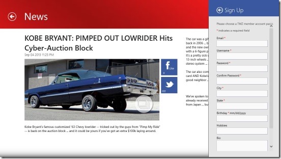 Reading news stories within the app is also a good experience. The stories are as crisp and sharp as possible, taking out all the boring stuff. Making a right click on the news story’s screen, gives you a flyout at the bottom of the screen. This flyout contains buttons for Pining the story at the Windows 8 Start Screen, adding the story to favorites, and making a comment. Obviously you’ll need to login with your TMZ credentials in order to make a comment or adding to favorites. One good thing that I liked about the app is, if you don’t have a TMZ account, then, the app lets you sign-up from within the app itself. All you have to do is open Windows 8 Settings Charm (Win + I) and click on Sign Up.