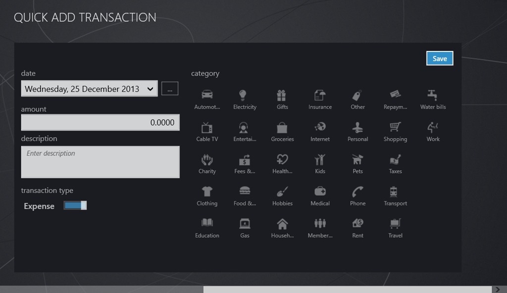 Firstly input the date for that transaction, the amount for it, any description about it, and its type, that is, weather it is Expense or income. In the panel that is presented on the right side of the app, you would be shown a number of categories. Decide your category, and click on the save option that is mentioned on the upper right side. That transaction has now been saved.
