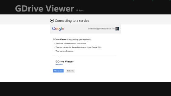 Now, just enter your credentials and click on the the Sign in button. This will bring up the window as shown in the screenshot below where Google will ask you to grant access to GDrive Viewer, just click on the Allow Access option. Now you will have the interface as shown in the first screenshot of this post.