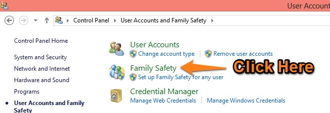 - The next step in this tutorial is opening up the Family Safety. To get into the family safety, click on the option as pointed out in the screenshot for your convince.