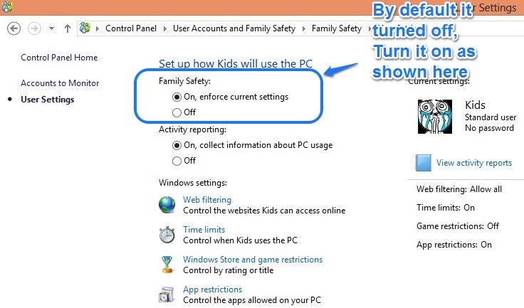 - Now that we have enabled the Family Safety for your kid’s account. Let’s Learn what options Family Security offers us; so that you can monitor your child’s activity on the PC. This feature of Windows 8 offers up ability to report activity that has been carried out in the account in which you have enabled the function. Also, Family Safety in Windows 8 provides you with four features as listed below.