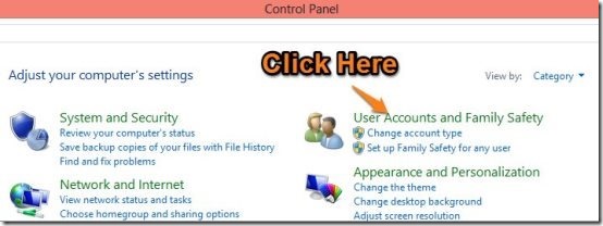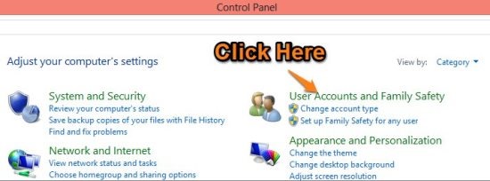 - Now click on the “ User Accounts and Family Safety” option in the control panel as seen in the screenshot below.